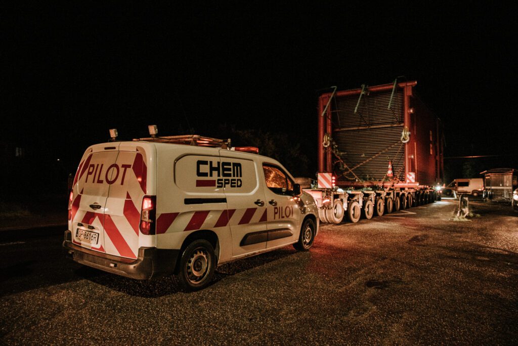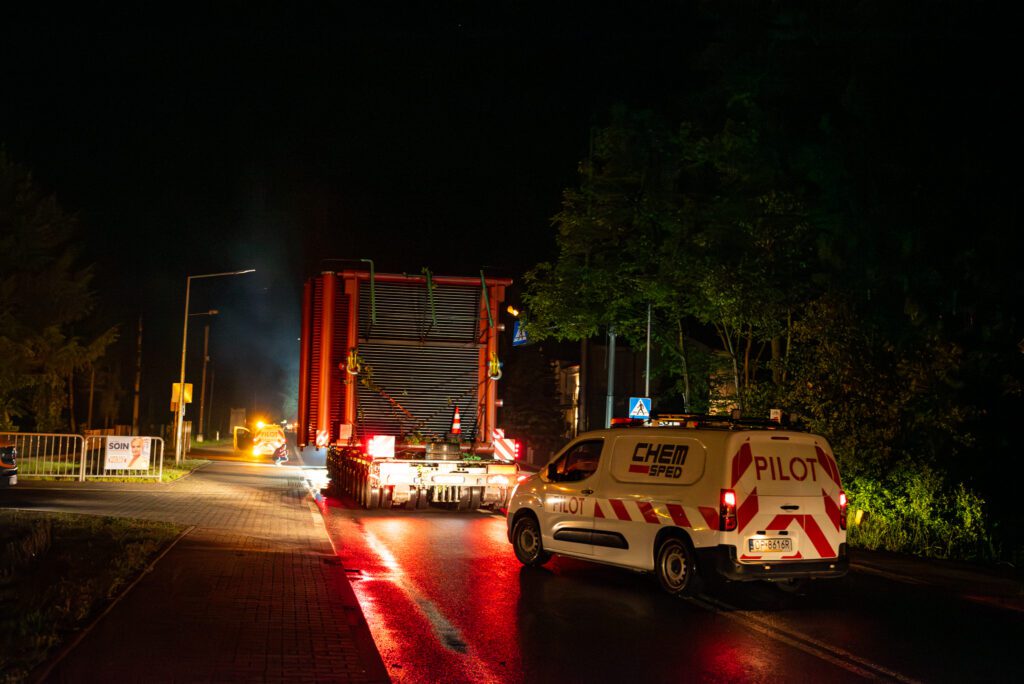 Do obsługi transportu poza zewnętrznymi firmami, niezbędna była asysta 6 pilotów Chem-Sped oraz 2 wozy techniczne. Finalnie po 8 nocach, transport bezpiecznie dojechał do portu rzecznego w Opolu.